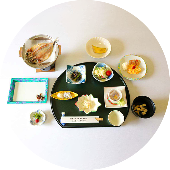 脂の乗った熱々のお魚を中心に、地元の恵みを少しずつ味わえる彩り豊かな小鉢、そして丁寧に出汁をとったお味噌汁。心も身体もほっと温まる、バランスの取れた優しい朝御膳をご用意しております。穏やかな朝のひとときを、ゆっくりとお楽しみください。
