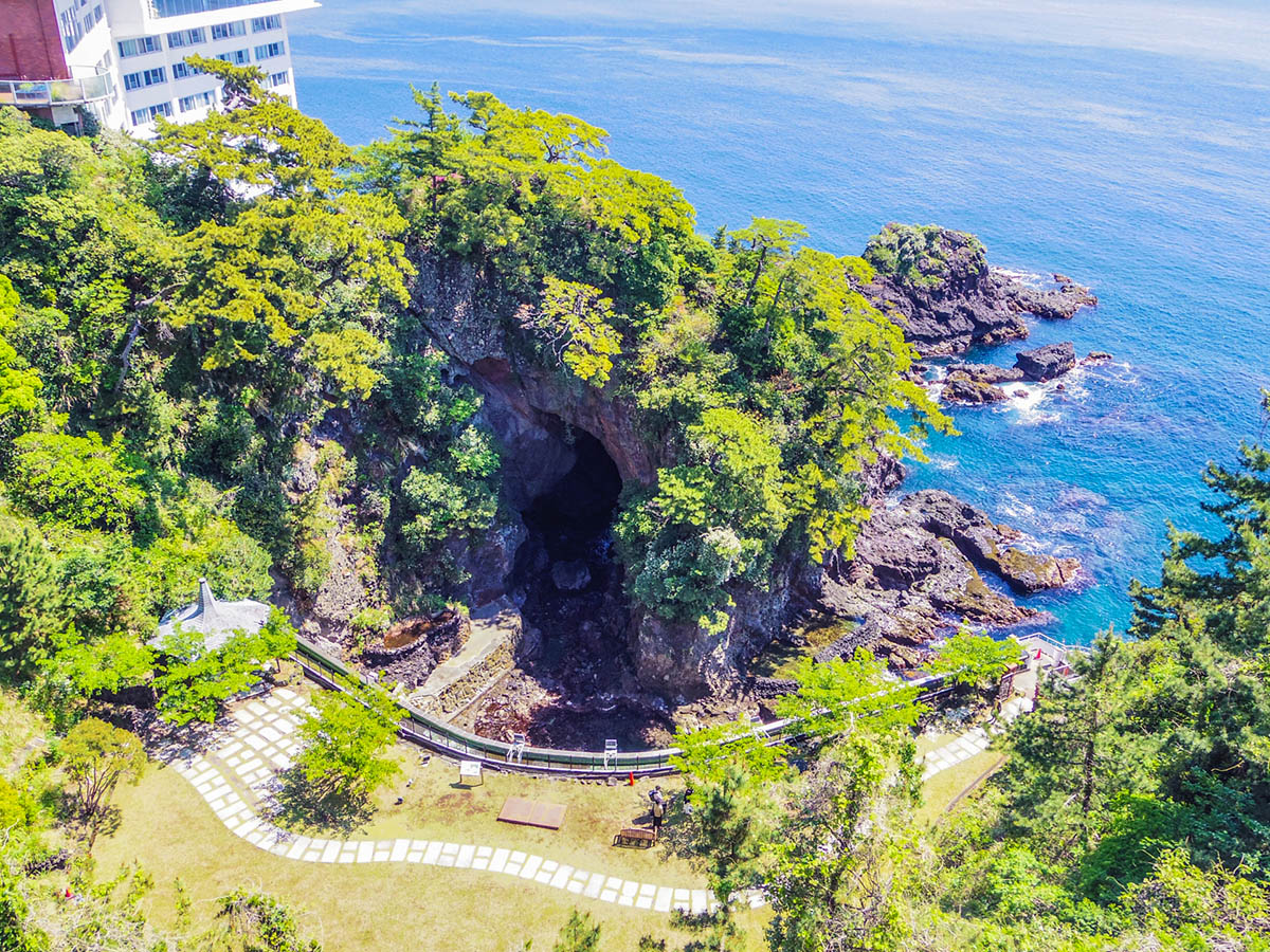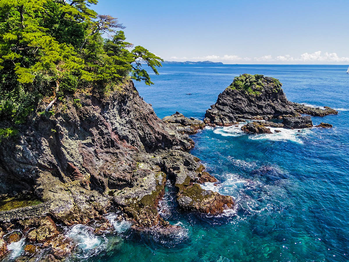 錦ヶ浦の最大の魅力は、なんといってもそのダイナミックな地形です。およそ数十万年前の火山活動と、相模灘の荒波による浸食によって削り出された奇岩や洞窟が連なっています。高さ約80メートルにも及ぶ断崖絶壁の上から見下ろす海は、足がすくむほどの迫力!透明度の高いエメラルドグリーンの海と、力強い岩肌のコントラストは、まさに自然が創り出した壮大なアート作品です。